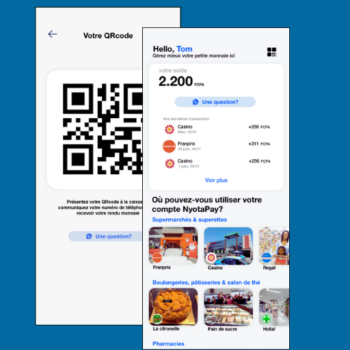 Avec NyotaPay, dites adieu aux pièces manquantes et aux frustrations. Notre solution permet aux commerçants de vous créditer instantanément le montant exact de votre rendu monnaie, directement sur votre téléphone, via votre compte NyotaPay. Accumulez et dépensez votre solde à votre rythme, dans les commerces partenaires.